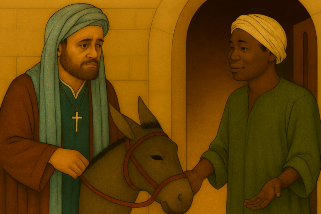 یوسف به سوی سامرا رفت؛ شهری که هرگز ندیده بود. چون به آن رسید، با خود گفت: «پیش از آنکه پایم به دربار متوکل رسد، باید صد دینار را به ابن‌الرضا (علیه‌السلام) تقدیم کنم. اما بیم داشت که پرس‌وجوی یک نصرانی از خانه امام، خشم متوکل را برانگیزد. پس اندیشید و در دلش افتاد که بر استر خود سوار شود و بگذارد هر جا خواست برود؛ شاید بی‌آنکه از کسی بپرسم، مرا به خانه امام رساند. الاغ کوچه‌ها و بازارها را پیمود تا به درِ خانه‌ای رسید و ایستاد.