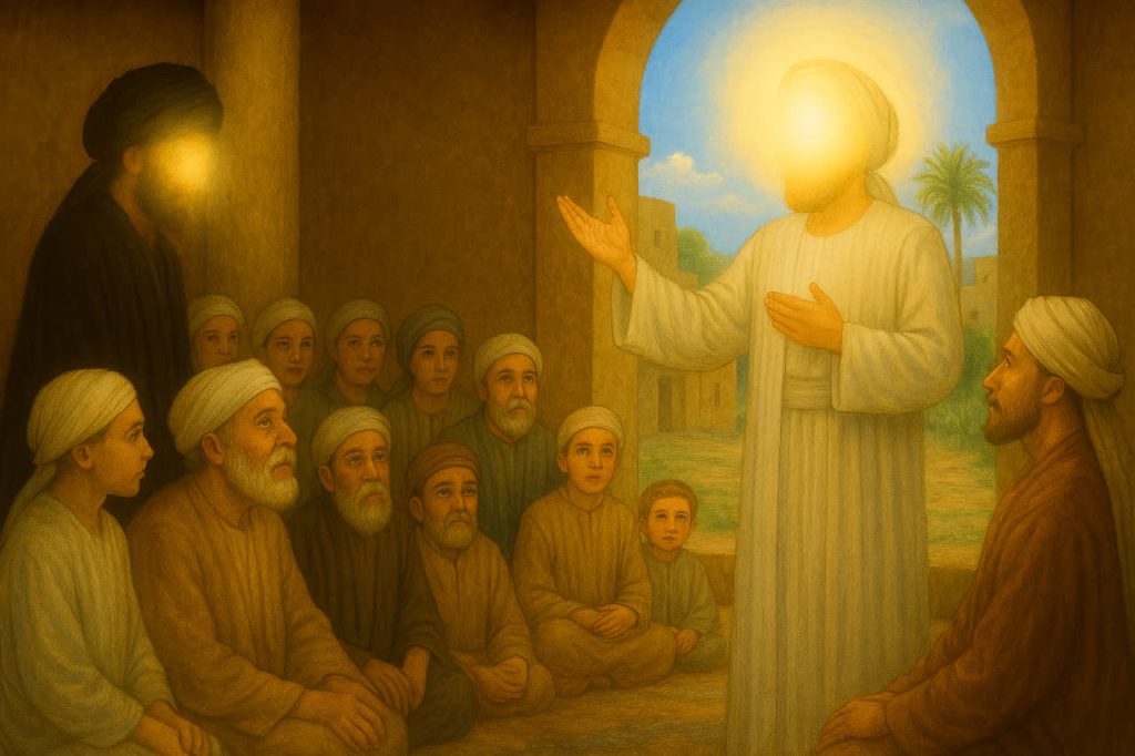 در این میان، رسول خدا(صلی الله علیه وآله) برخاست. ردای سپیدش در نور صبحگاهی می‌درخشید و چهره‌اش آرامشی داشت، گویی از معراج می‌آمد. نگاهش بر جمع گذشت؛ نگاهی که هر دل مضطربی را آرام می‌کرد. با صدایی که عمقش در جان می‌نشست، فرمود: